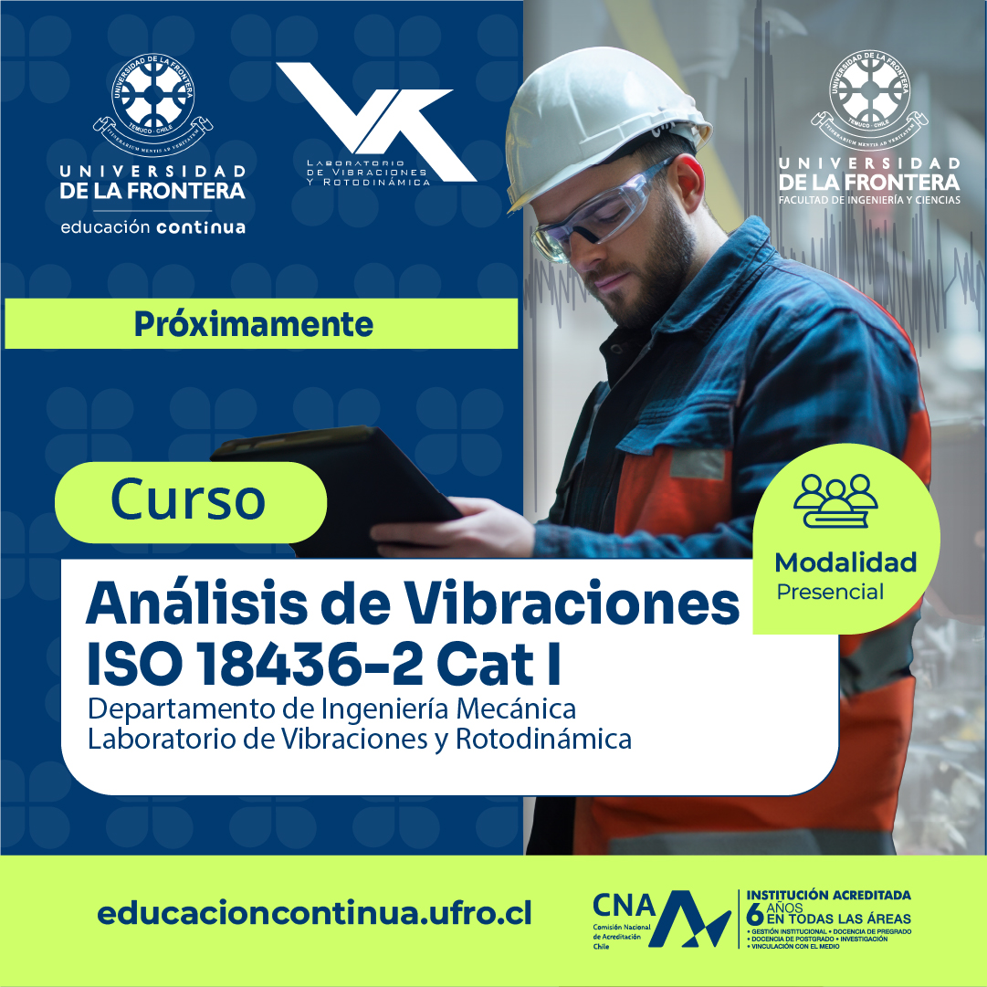 Este curso ofrece una formación especializada, dirigido a profesionales y técnicos que deseen iniciarse en el monitoreo y diagnóstico de maquinaria mediante técnicas de análisis de vibraciones, permitiendo optar a la certificación como "Analista de Vibraciones Categoría I" otorgada por la Universidad de La Frontera, conforme a los requisitos establecidos en la norma internacional ISO 18436-2.